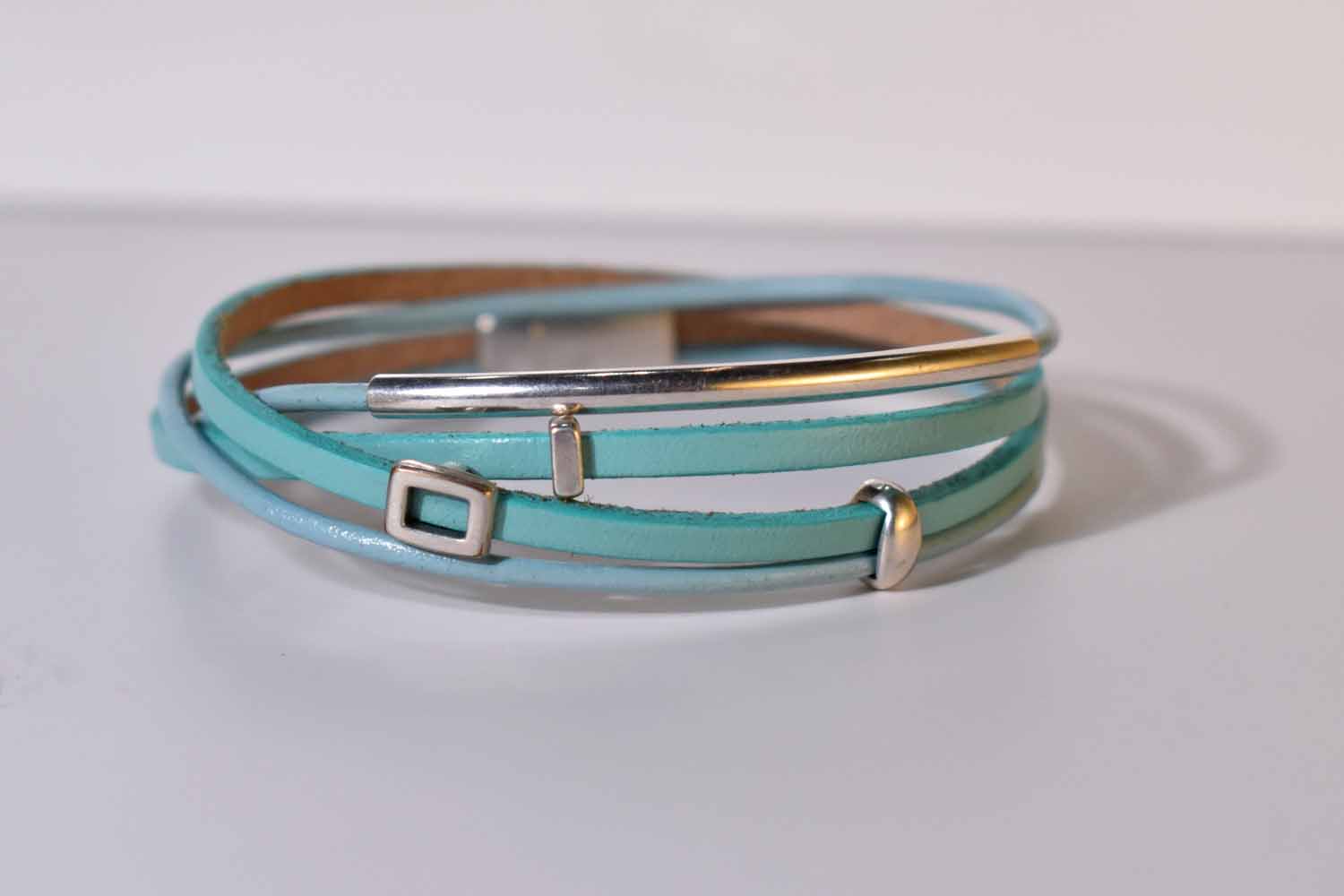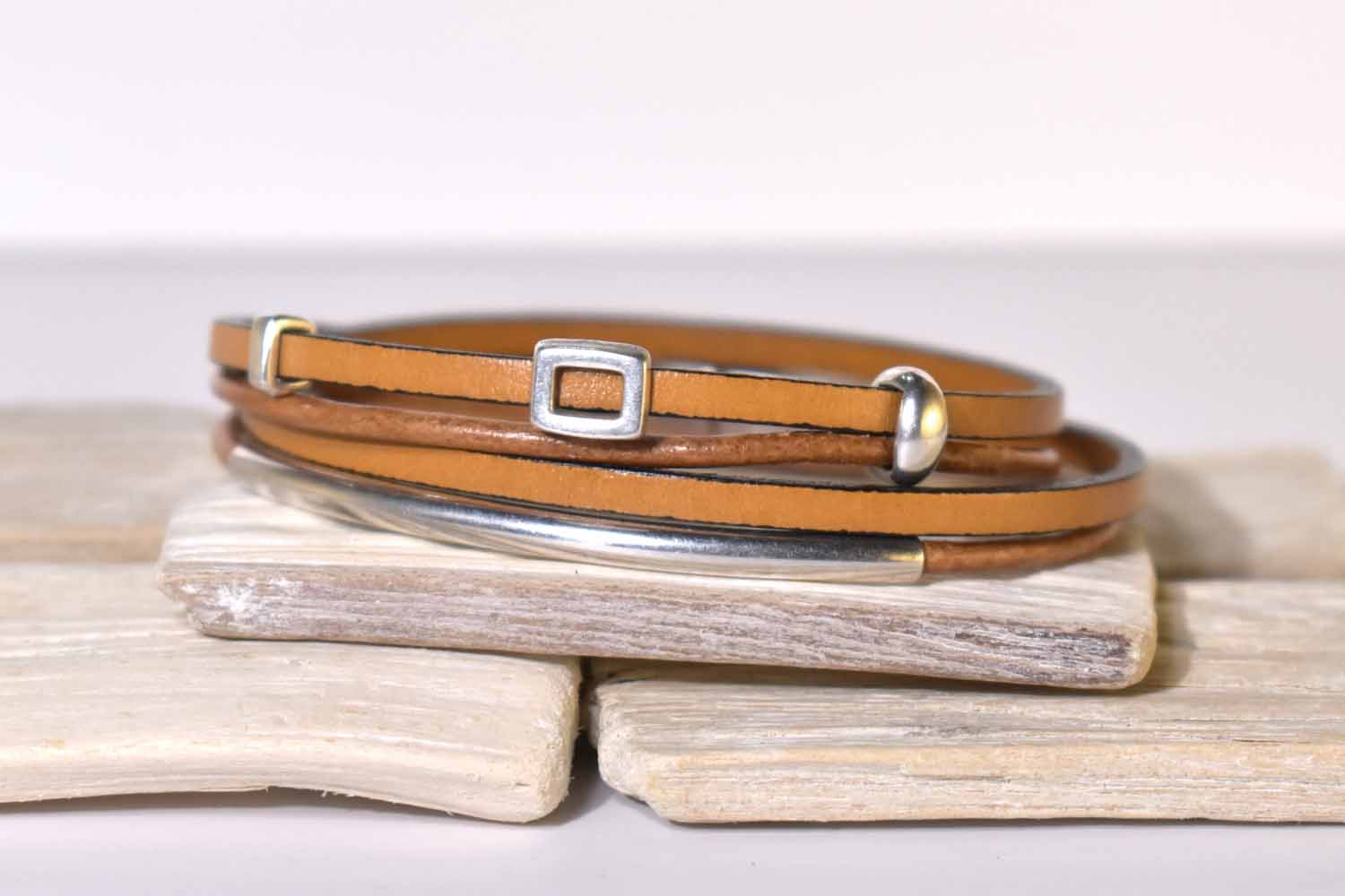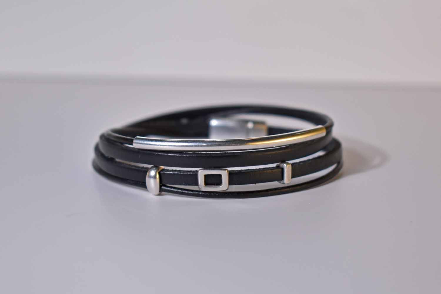 This asymmetrical bracelet is one of our new favorites! Two strands of leather wrap around the wrist twice, and feature four beads, some of which slide around if you want. It is made with our signature magnetic clasp made of sterling over pewter.