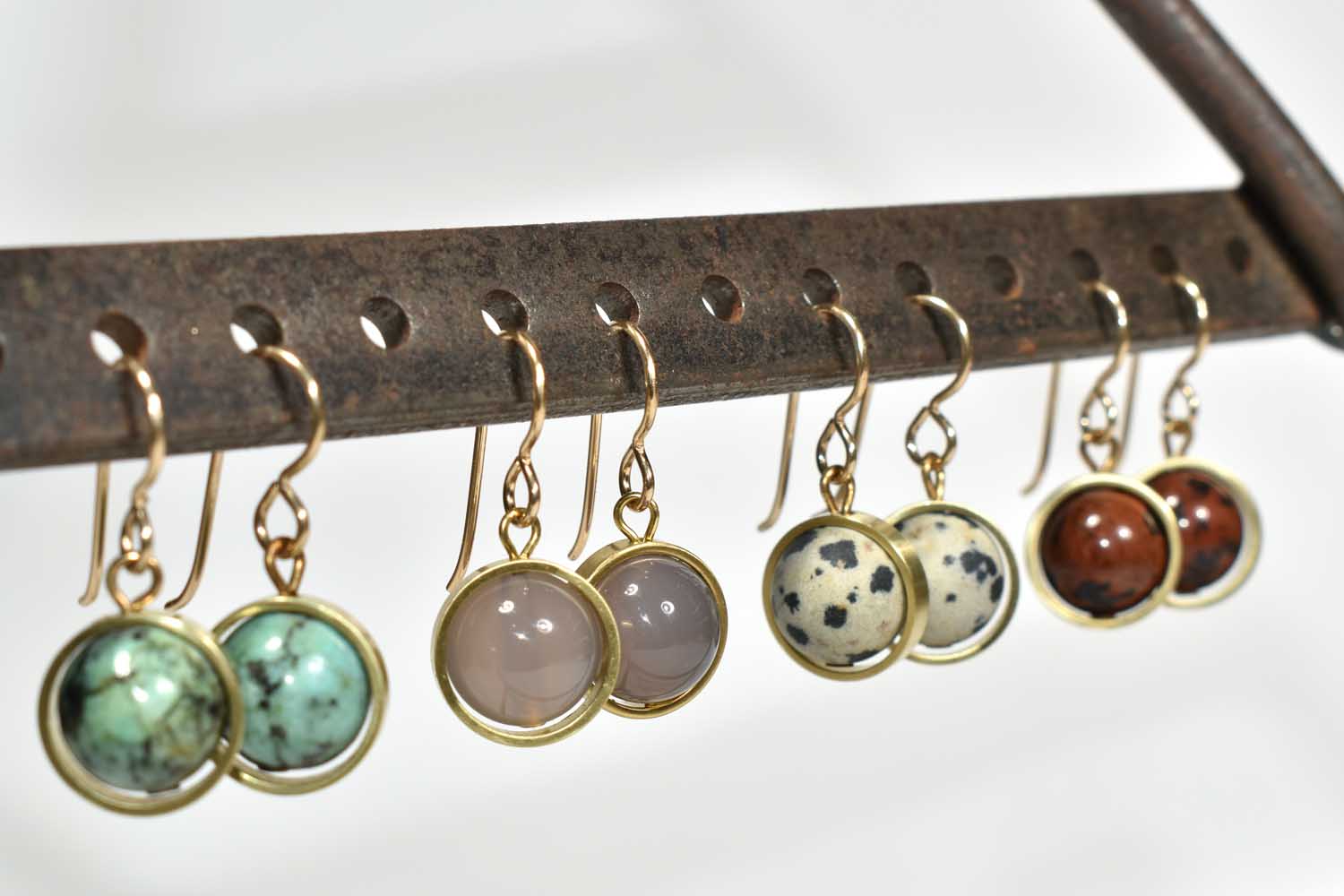 These brass framed semi-precious stone earrings come with gold-filled ear wires. They are a great every day kind of earring. Stone gorgeous options: African Turquoise, Grey Onyx, Dalmatian Jasper, and Mahogony Jasper.