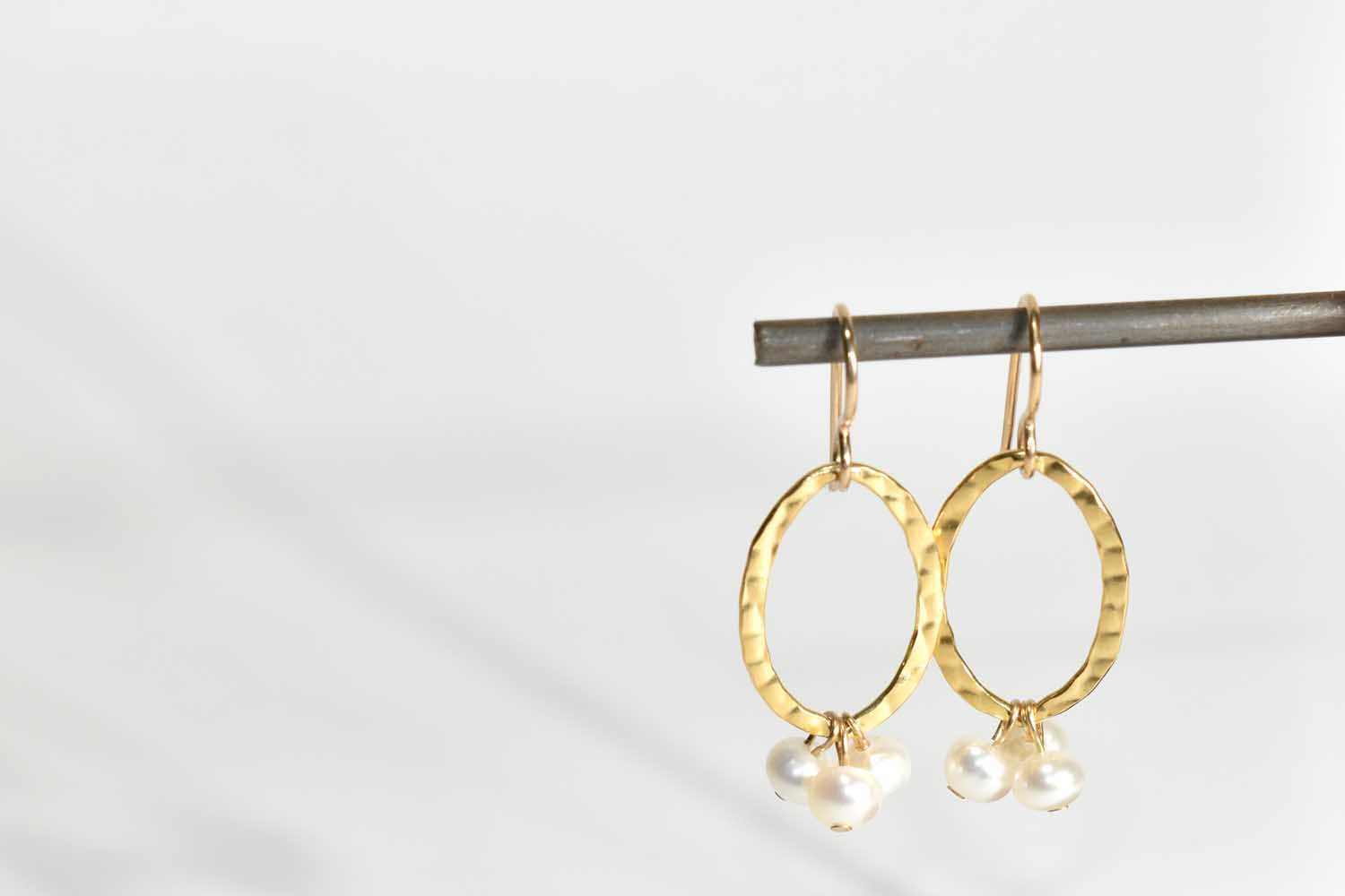 These are so adorable, and a great timeless pair of earrings. Three fresh water pearls adorn gold-filled textured ovals. They have gold-filled hypo allergenic ear wires.