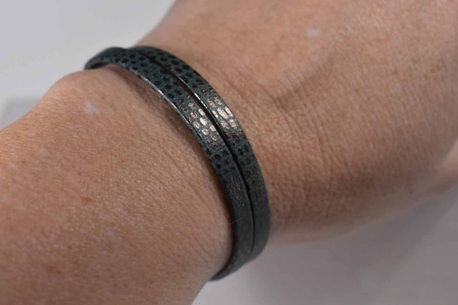 This supple dark green leather with a metallic print comes with an antique brass over pewter magnetic clasp.