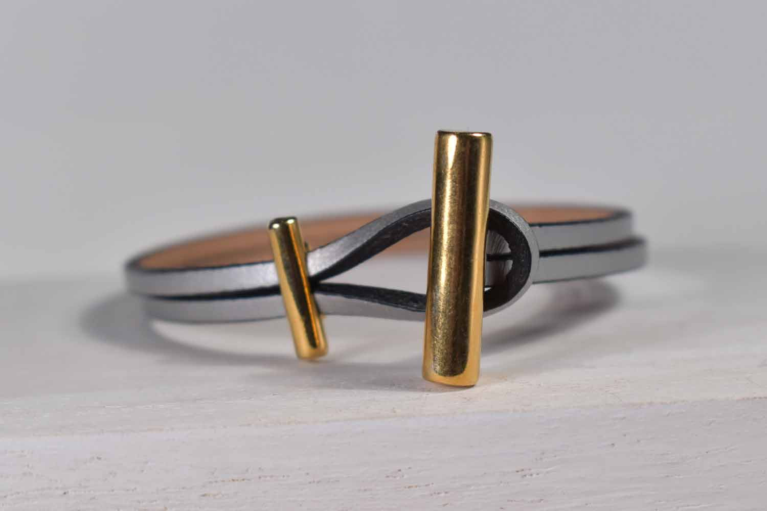 This modern twist on a toggle clasp is simply cool. We suggest erroring on a tighter fit with this bracelet so the clasp stays put on the top of the wrist. The leather strips are 3mm wide making it a nice delicate bracelet. It comes in three additional colors: dark grey, slate blue and our picasso print. The clasp is 18kt gold over pewter.