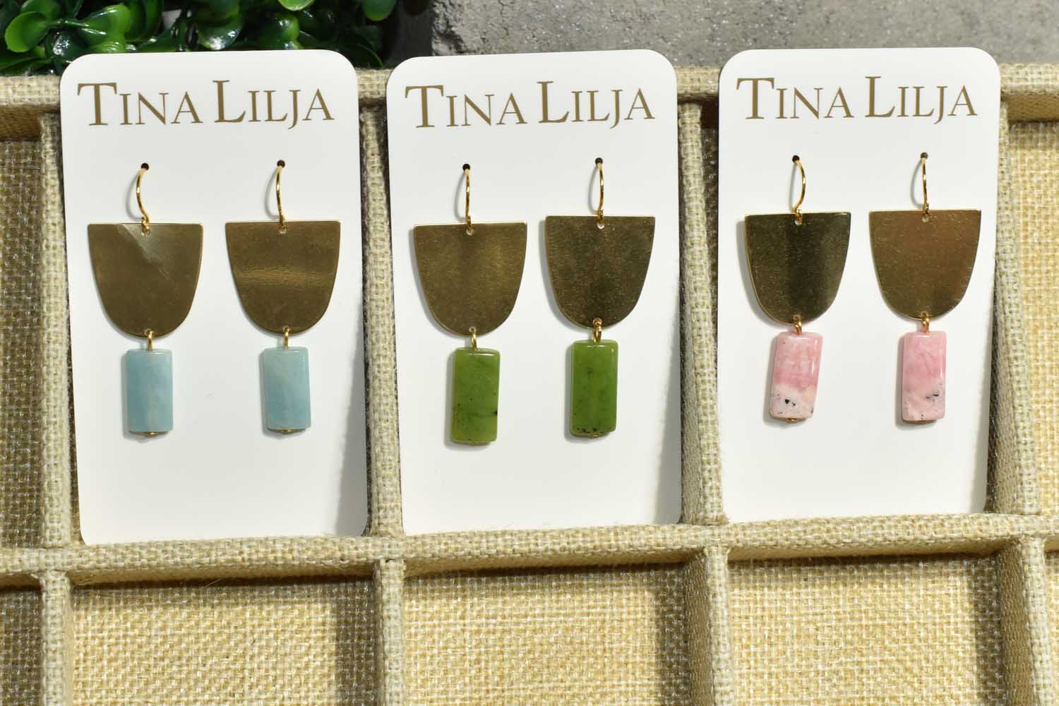 These earrings are made of brass and Semi-Precious Amazonite, Jade, or Rhodochrosite. The ear wires are hypo-allergenic.