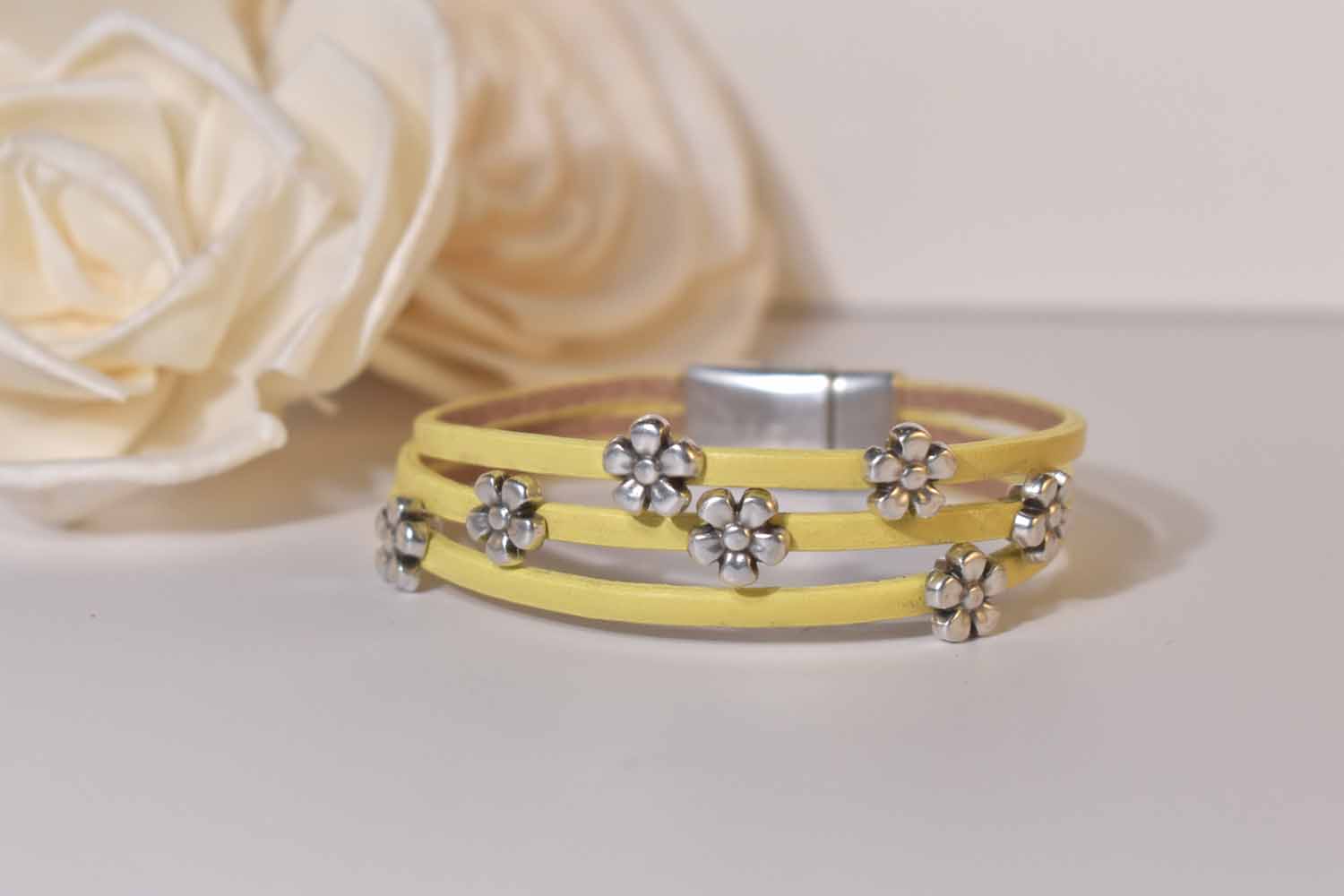 This delightful bracelet is made with three strips of 3mm wide leather and seven adorable daisies. It has our signature sterling over pewter magnetic clasp. If you are not sure what size to get please see the Leather Bracelet Sizing tab at the top of the page.