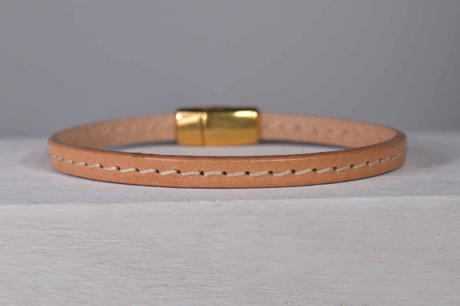 This beauty is great on it's own or but is great when paired with another bracelet. The natural leather is 5mm wide, has stitching running the length and comes with our signature magnetic clasp in 24kt gold over pewter.