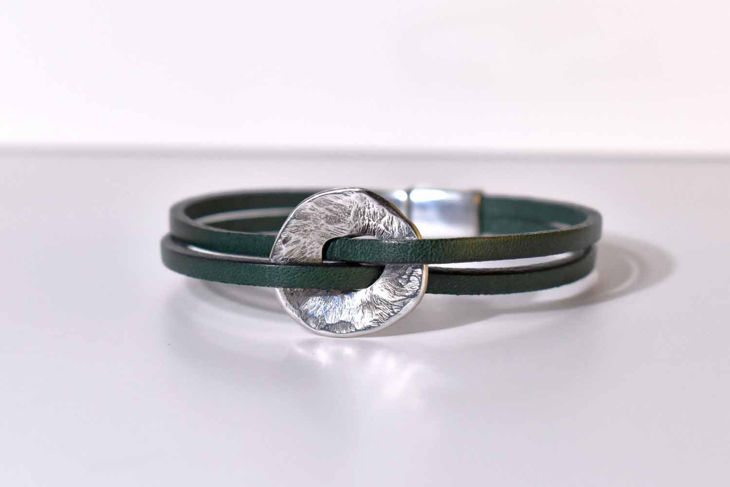 Two strands of 3mm leather wrap around the wrist, with a circular accent, in this classic bracelet. It is made with our signature magnetic clasp made of sterling over pewter.