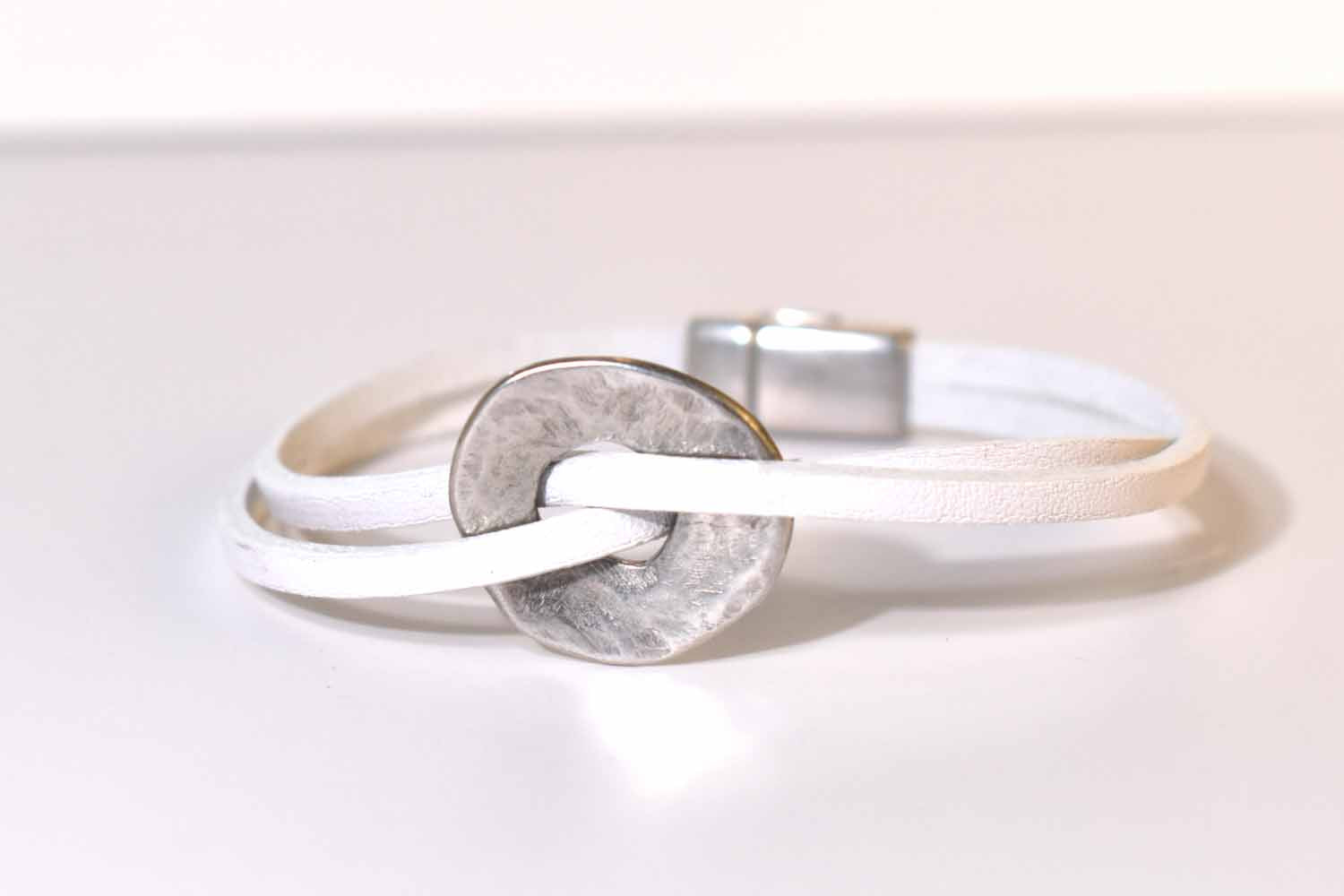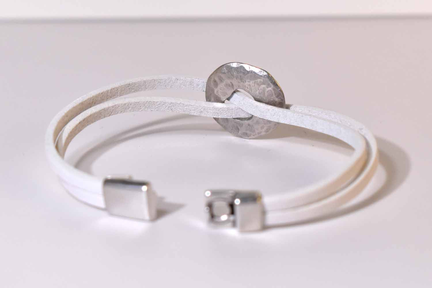 Two strands of 3mm leather wrap around the wrist, with a circular accent, in this classic bracelet. It is made with our signature magnetic clasp made of sterling over pewter.