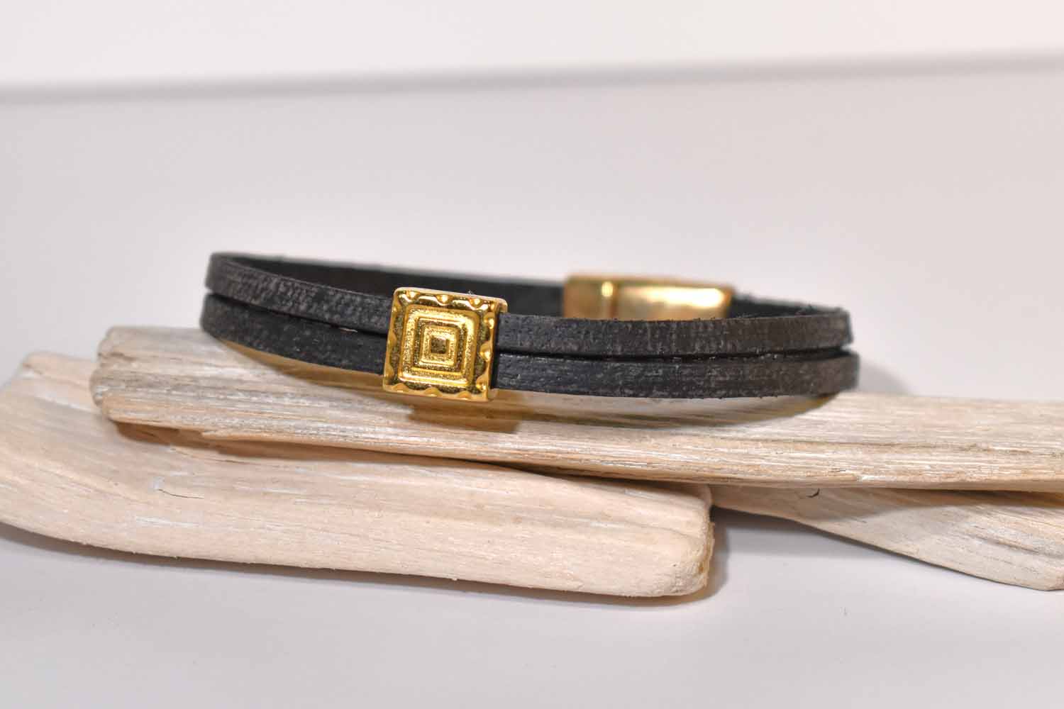 Two strands of 3mm leather wrap around the wrist, with a square slider accent, in this classic bracelet. It is made with our signature magnetic clasp made of 24kt gold over pewter.