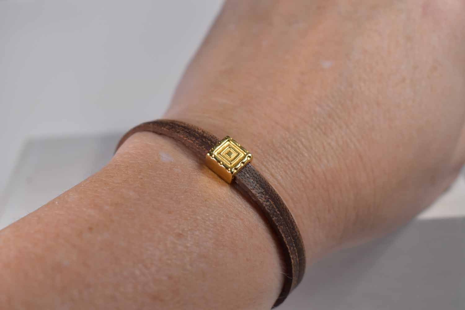 Two strands of 3mm leather wrap around the wrist, with a square slider accent, in this classic bracelet. It is made with our signature magnetic clasp made of 24kt gold over pewter.