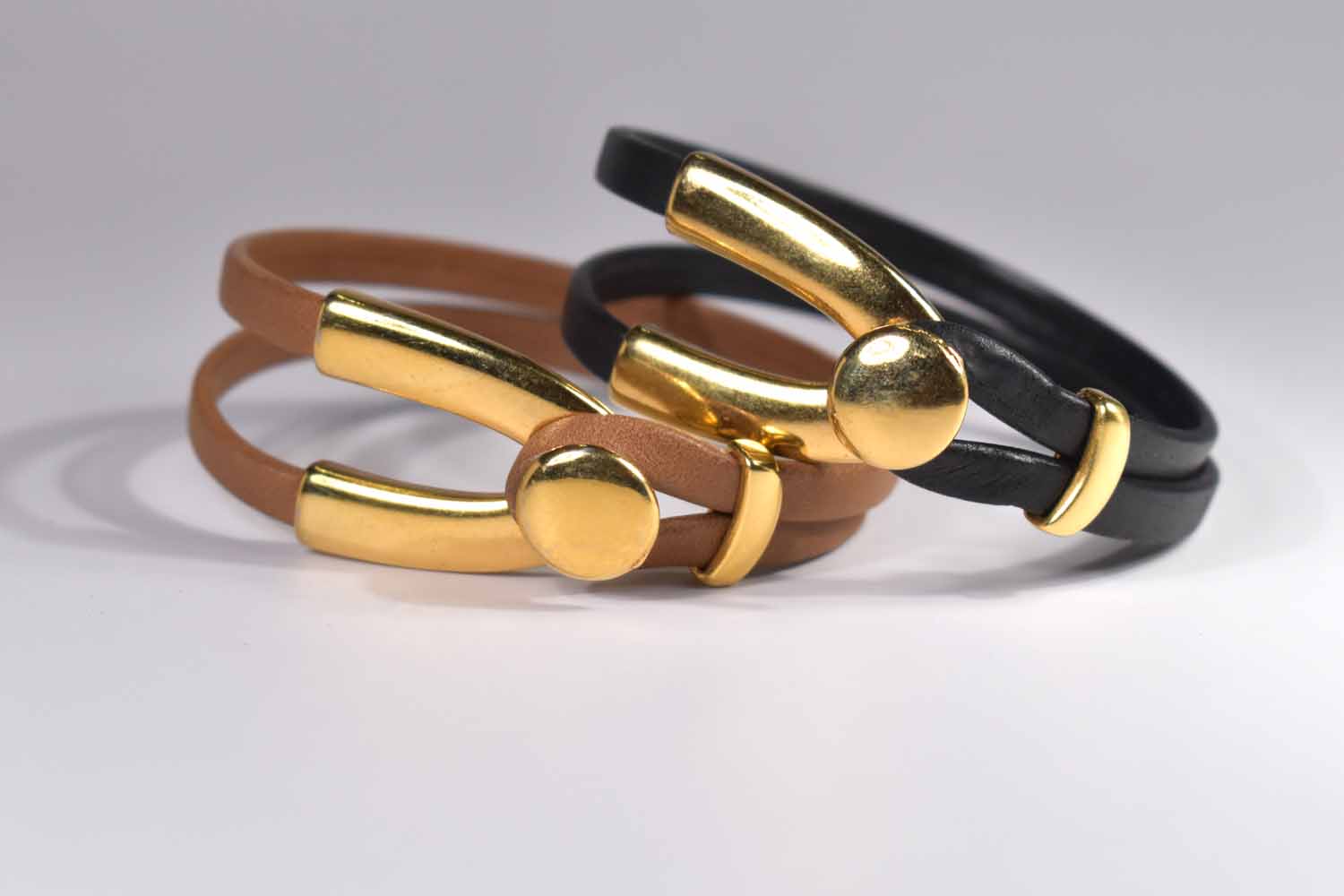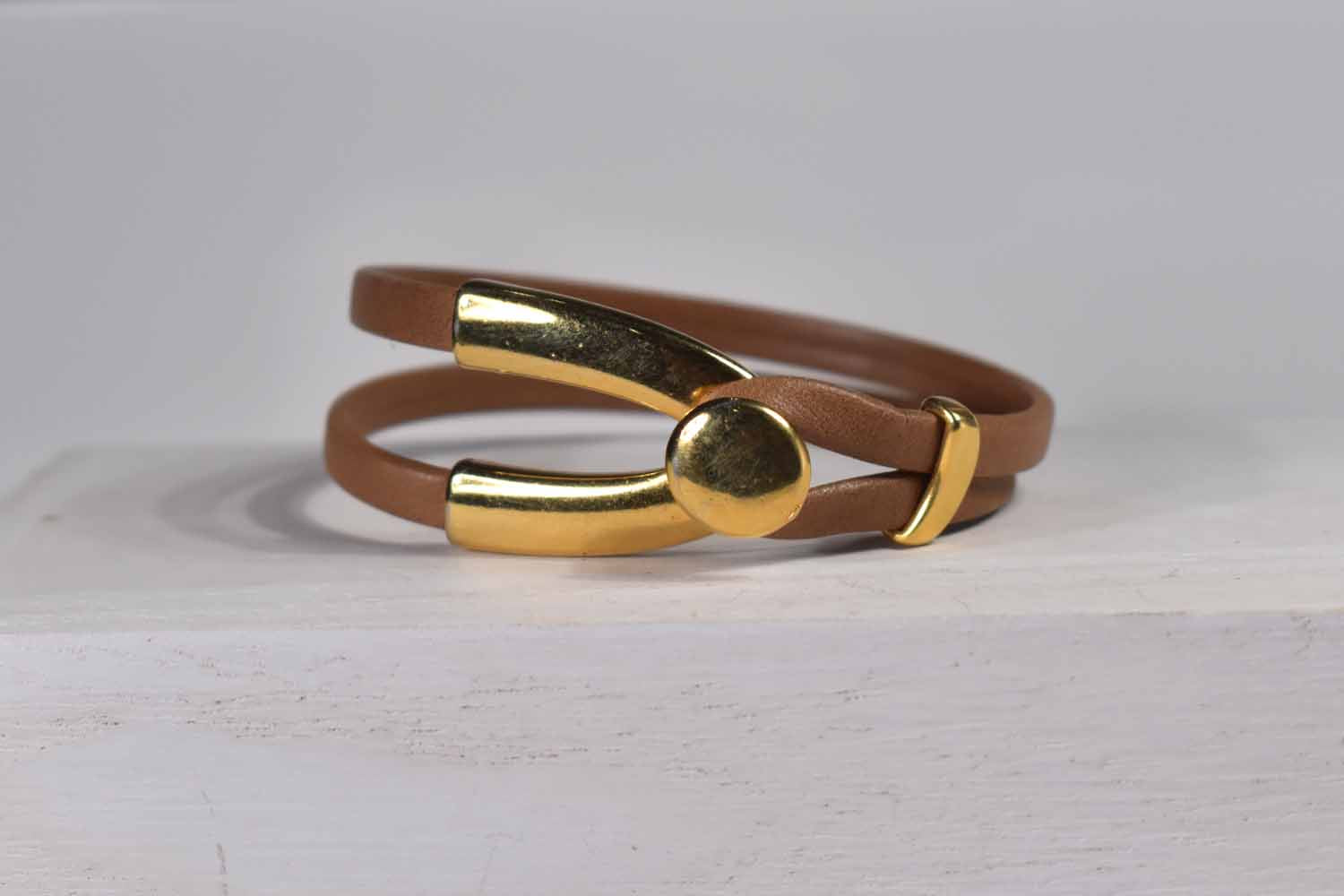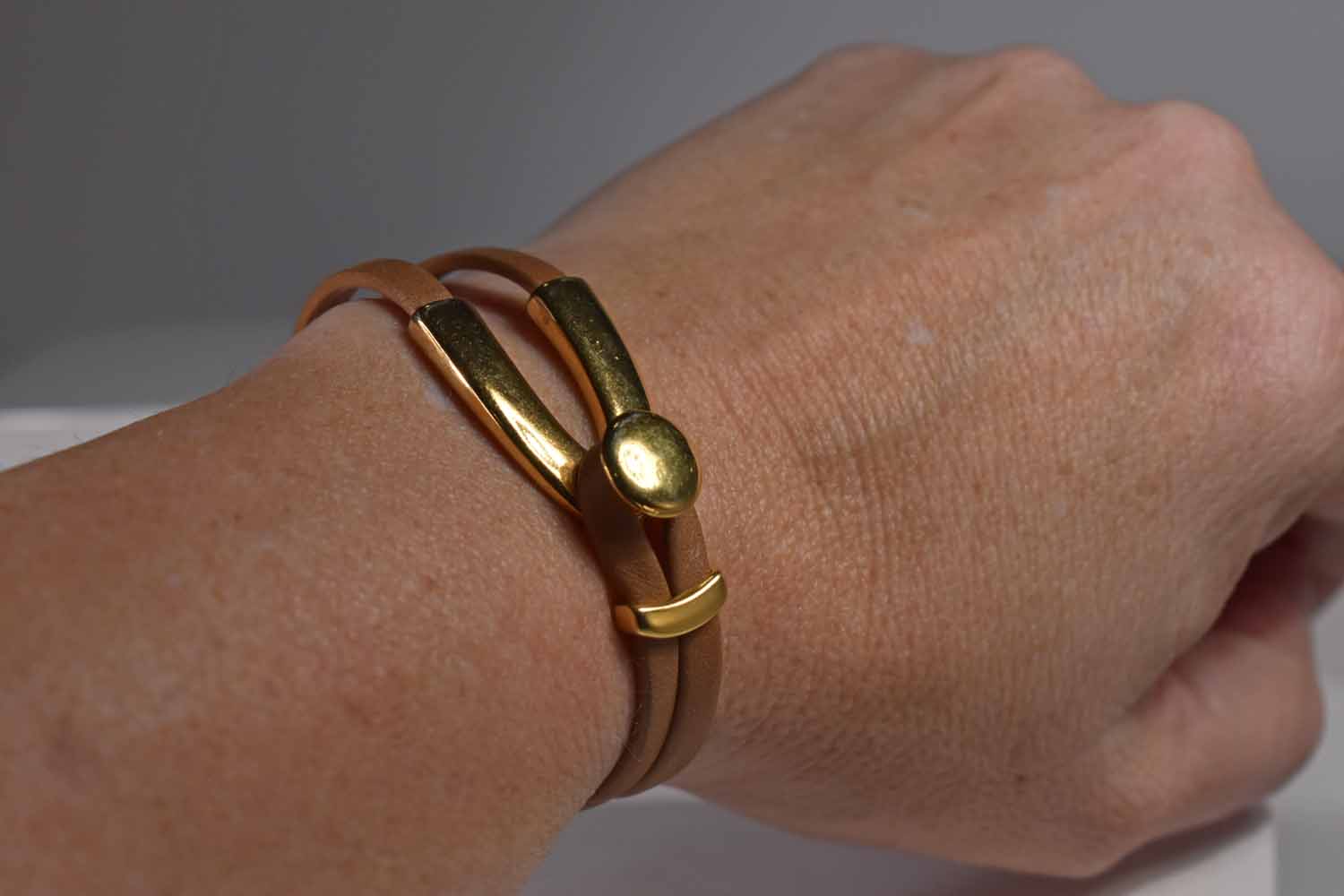 Two strands of 5mm leather wrap around the wrist, then clasp with a wishbone shaped button closure The moon shaped slider moves out of the way to make it easier to take on and off, and secure it incase you talk with your hands. The clasp is made of 24kt gold over pewter.