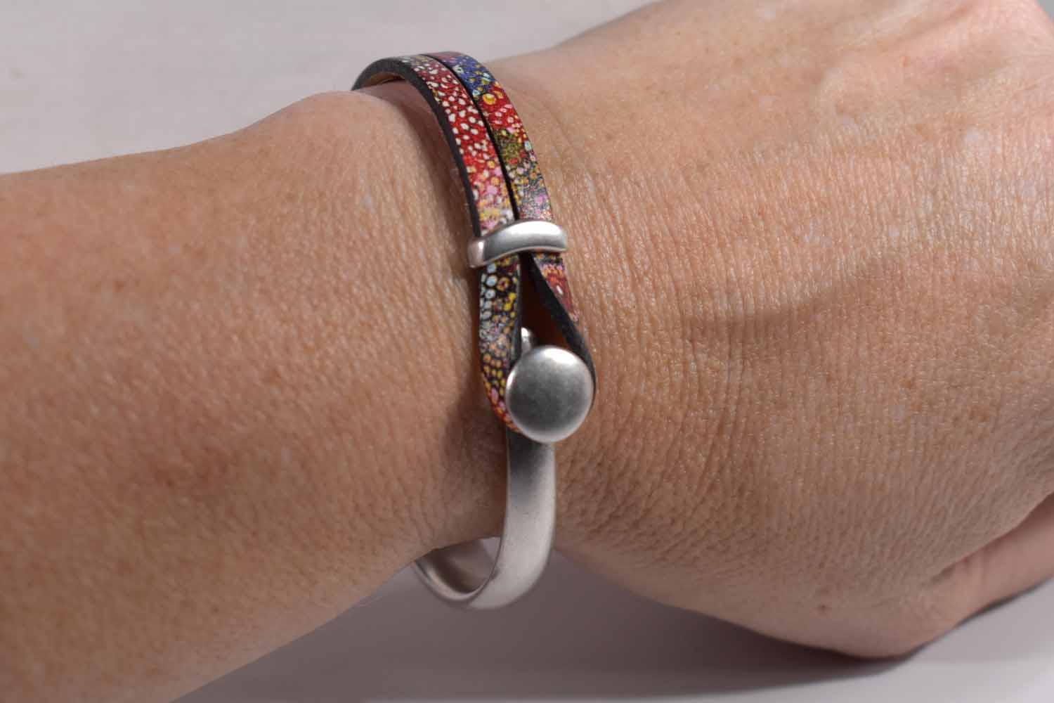 This leather is a vibrant red, blue, black and gold print, like fireworks! The half-cuff is made out of sterling over pewter and the bead slides out of the way to make it easier to take on and off.