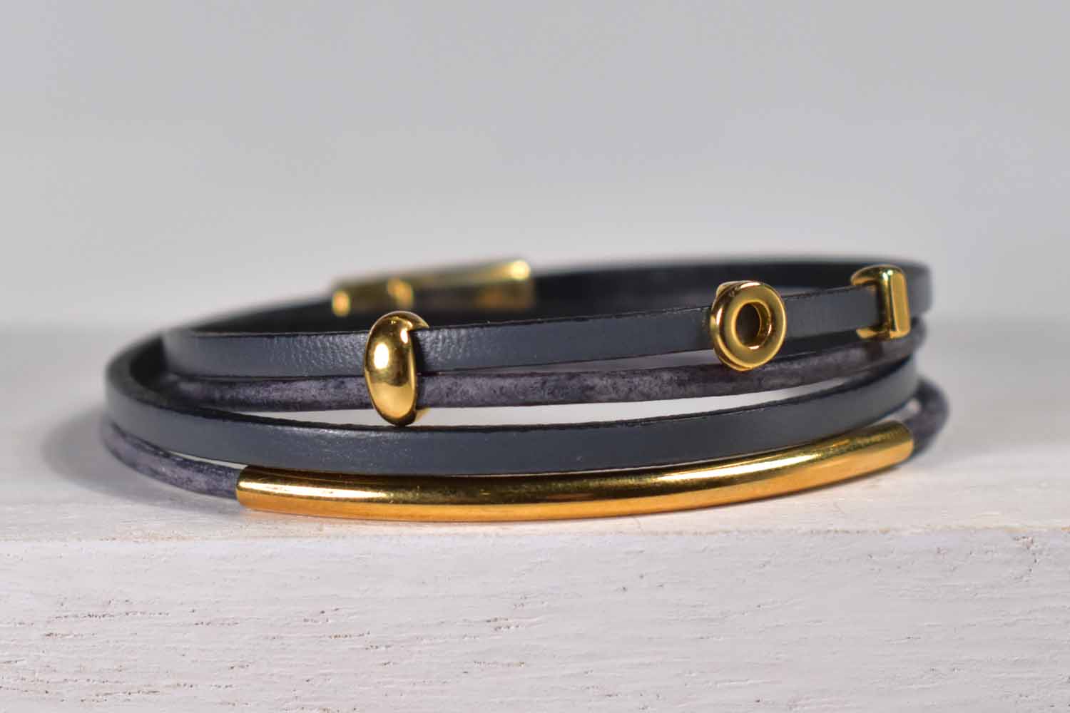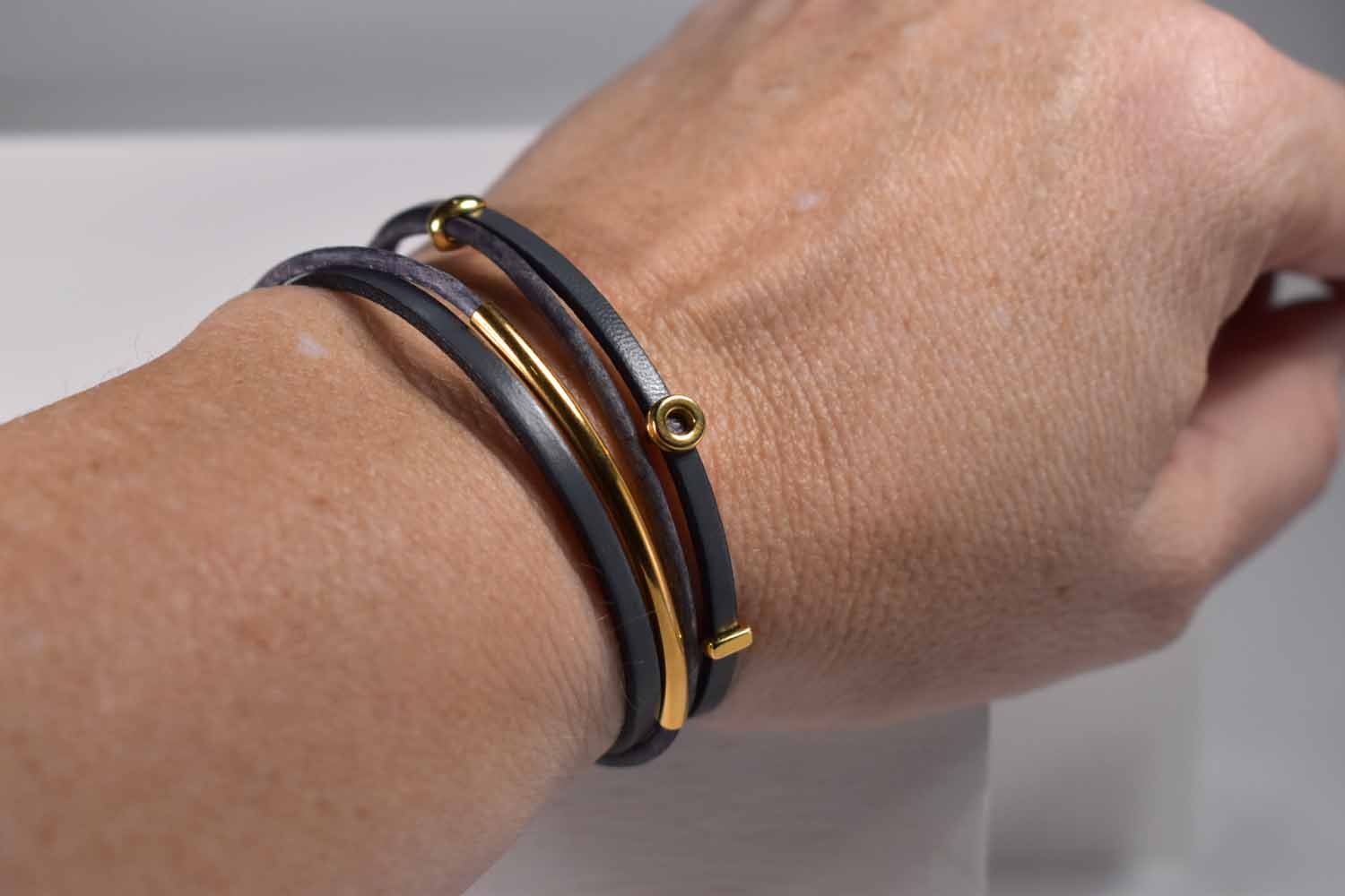 This asymmetrical bracelet is one of our new favorites! Two strands of dark grey leather wrap around the wrist twice, and feature four beads, some of which slide around if you want. It is made with our signature magnetic clasp made of 24kt gold over pewter.