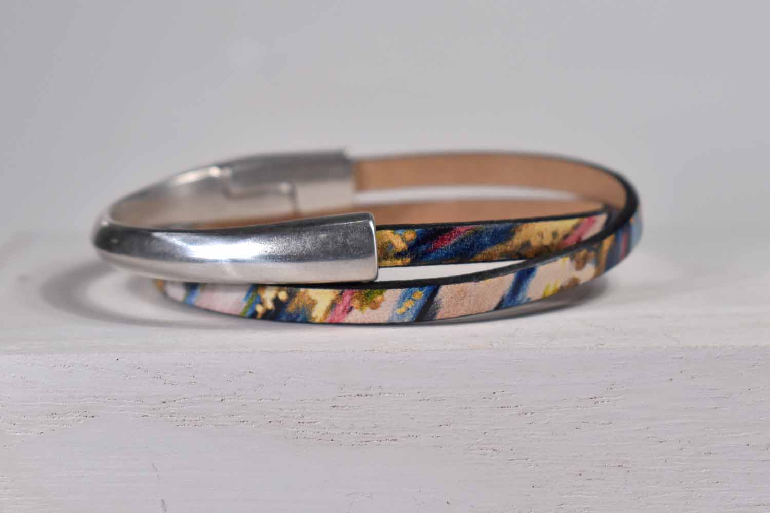 We really love how this leather is random and features cream, blue and a russet pink. The half cuff clasp is made of sterling over pewter and is also magnetic.