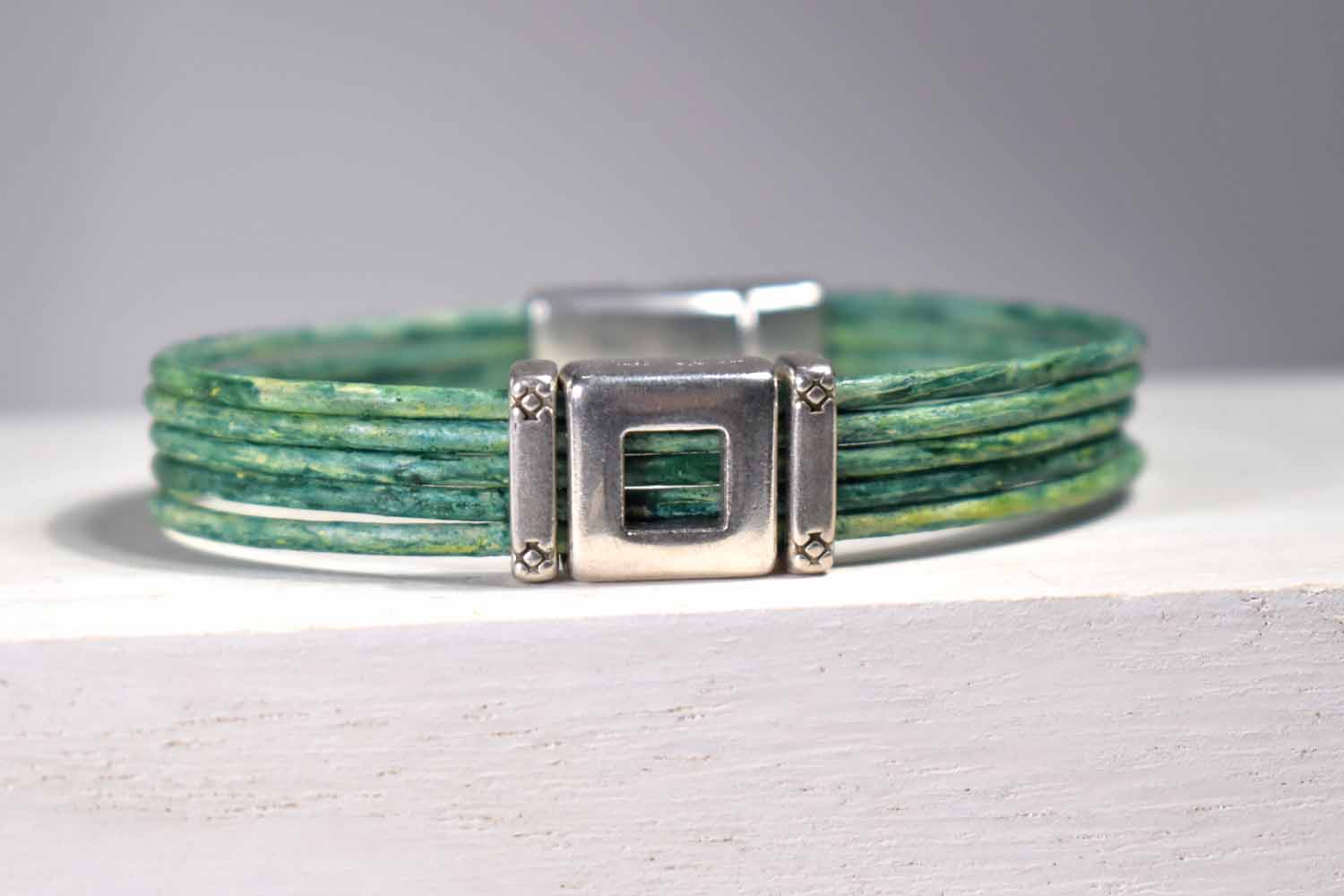 One of our favorite designs, this five strands of variegated green leather are combined with three separate silver sliders. It comes with one of our signature magnetic clasps.