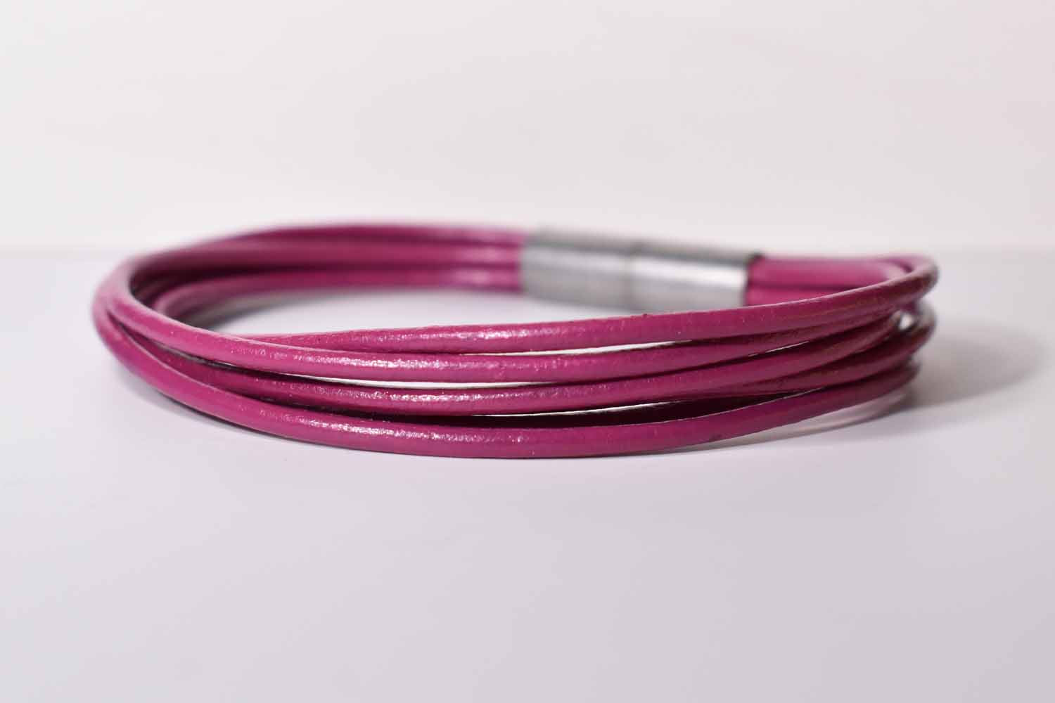 Six lovely strands of mulberry leather converge into an antique silver magnetic clasp.