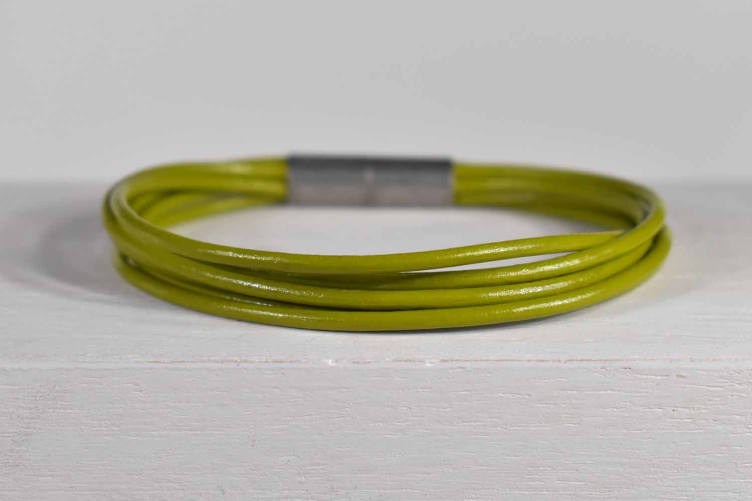 Six lovely strands of moss green leather converge into an antique silver magnetic clasp.
