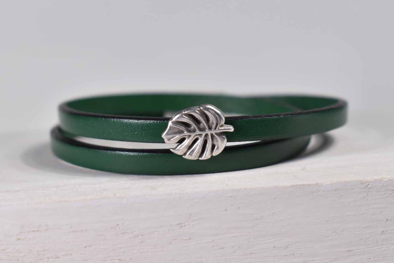 Beautiful bottle green leather that warps around twice on the wrist is combined with a lovely monstera slider. It comes with our signature magnetic sterling over pewter clasp.