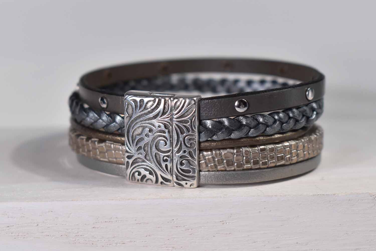 This knockout bracelet come has five strands of leather and a beautiful magnetic clasp. The shades of leather are dark grey, bronze, platinum, metallic grey, and gold. The clasp measures 20mm wide and one piece of leather has a silver tube on it.