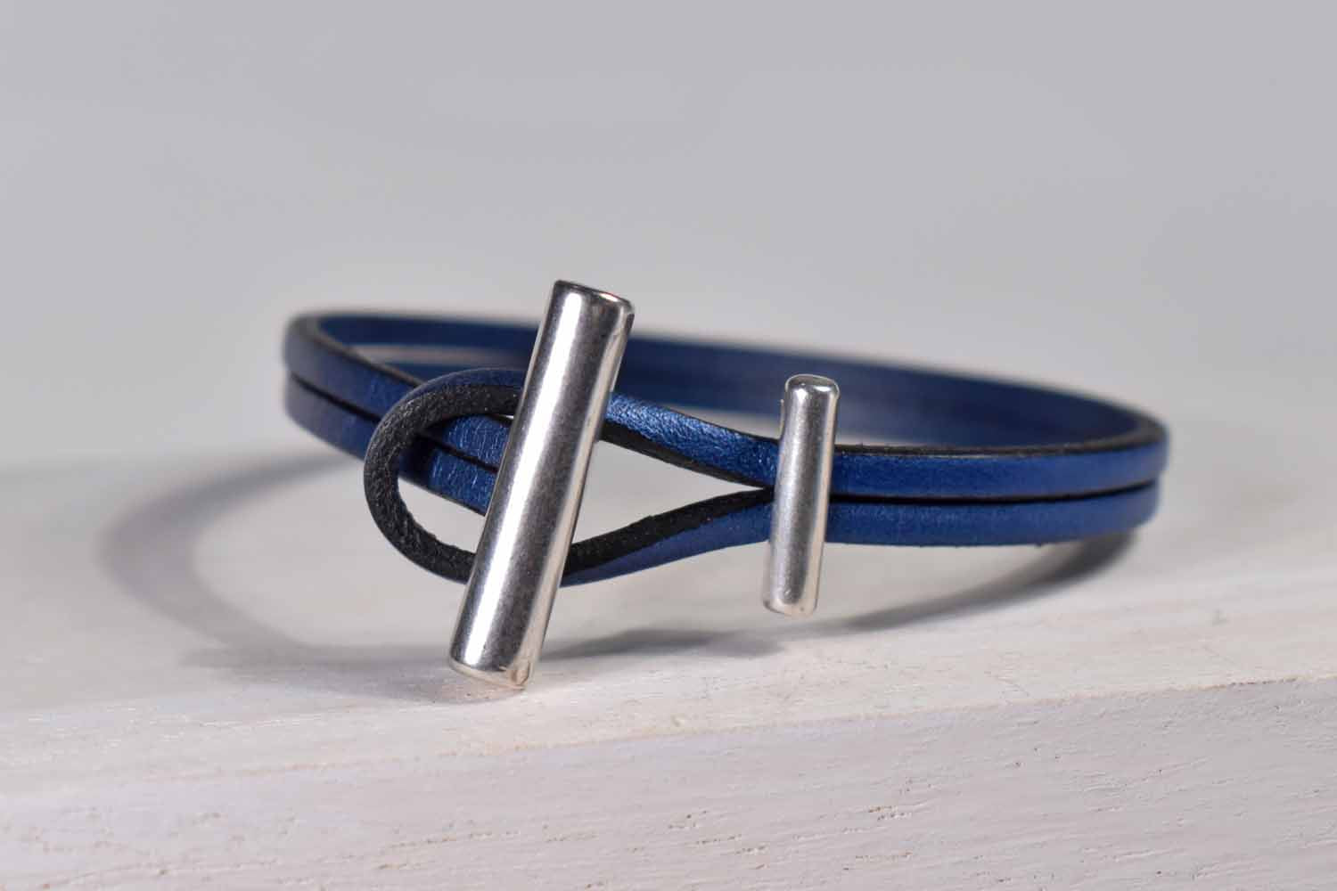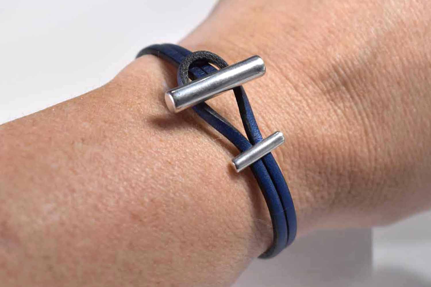 The clasp for this bracelet is meant to sit atop the wrist; it's made of sterling over pewter. We recommend it fits tighter than looser. The leather strips are 3mm wide making it a nice delicate bracelet.
