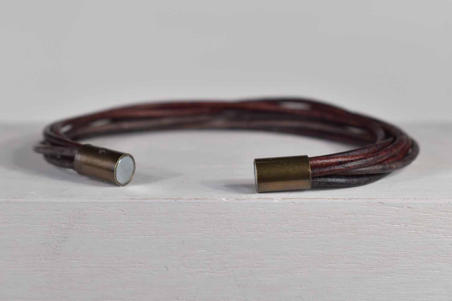 Six strands of variegated brown leather converge into an antique brass magnetic clasp.