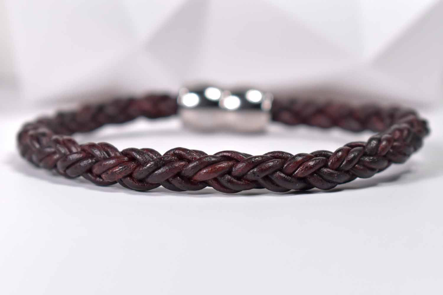 8mm round braided leather in dark brown converges in a wonderful stainless magnetic clasp. Men love this bracelet, and it make a great gift.